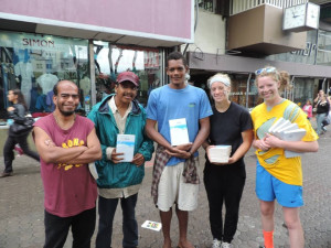 Maggie and a teammate give out Bibles to seekers in San Juan, Costa Rica.